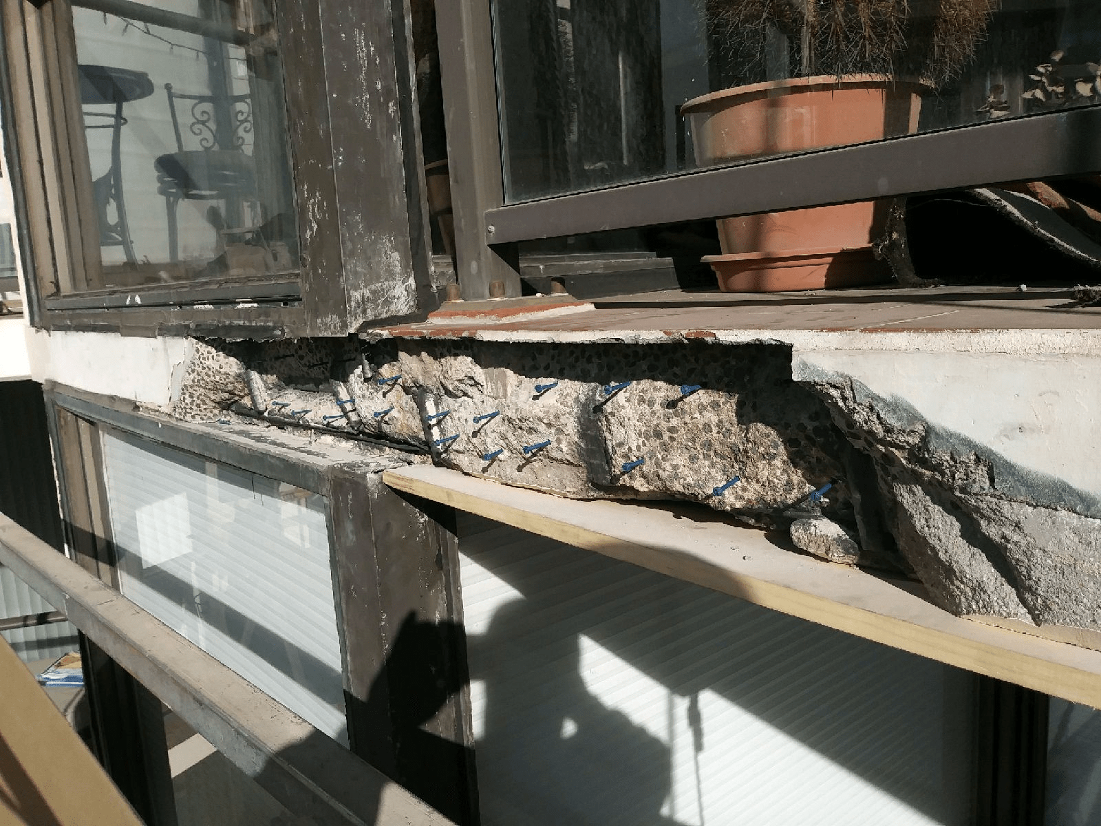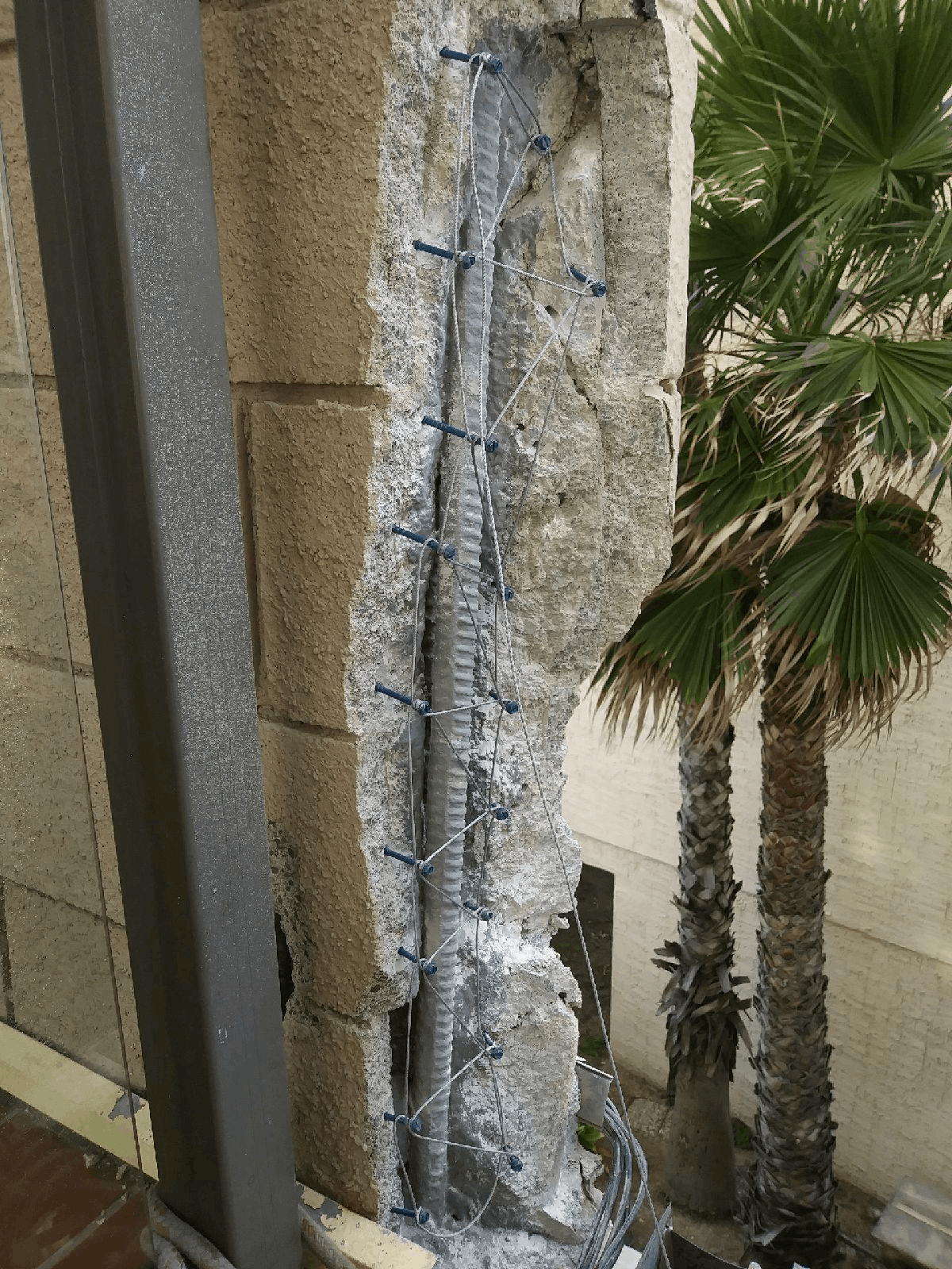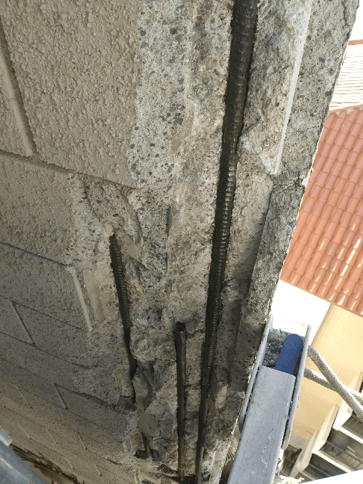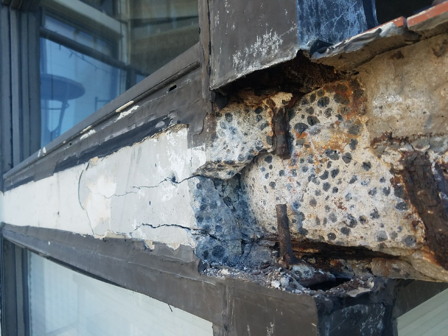Concrete buildings on the oceanfront are subject to salt air, chlorides from saltwater waves breaking, and onshore winds. This severe adverse condition causes the chlorides to penetrate cracks in the concrete. If it reaches the steel reinforcement rust is inevitable so over time the steel expands to over eight times its original volume causing deterioration of the concrete and the rebar reinforcement. The concrete breaks away, called spalling, causing the dangerous condition below along with compromising the building itself.