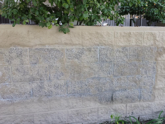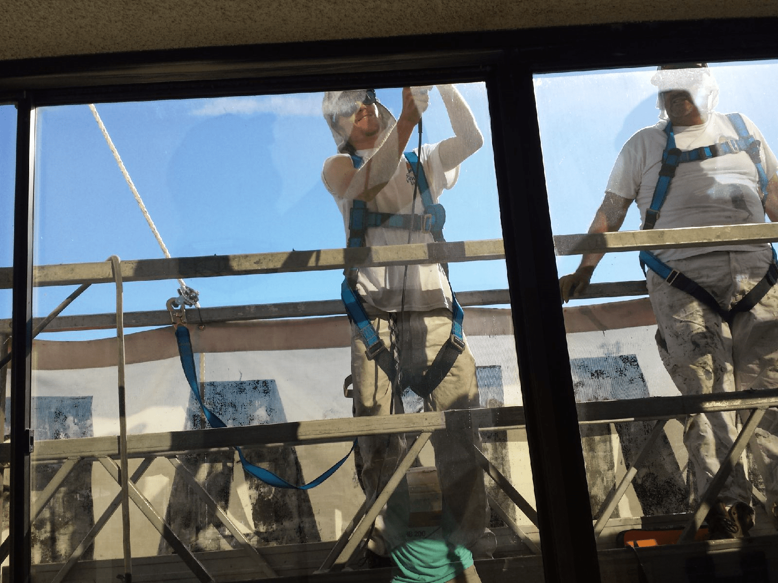 We removed the visible failing elastomeric coating on the masonry walls by hot water pressure washing with 5000 PSI and by using hand power tools.
