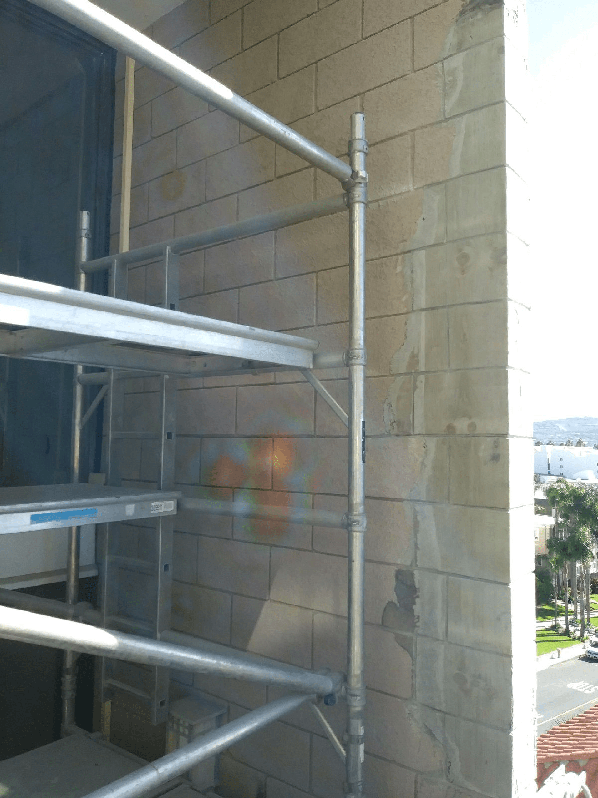 We employ expert concrete building repair methods by using high-quality repair materials and workmanship. We excavate the spalling, remove all rust, apply a protective coating to the cleaned steel rebar, perform a solid patch to restore the concrete to better than the original quality. On this project on the west elevation we removed all the old foam backer rod and all the existing caulking, cleaned all joints, installed a new backer rod, re-caulked with all new BASF 150 urethane caulking material, after curing we masked all the windows, high pressure washed the entire wall, full primed all the concrete with BASF 100 primer, then applied two coats of BASF HB 200 waterproofing coating in two separate colors giving the building a beautiful new look making it waterproof once again.