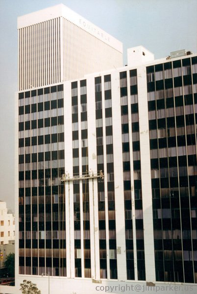 Parker completed the painting project in minimal time, doing extra work even painting the parking structure interior, line striping, painting stairwells, resealing the 3470 building windows, and providing a 20-year waterproof warranty. On Jan 17, 1994, the massive Northridge Earthquake struck, causing hundreds of annealed glass windows to break in these buildings; fortunately, most were tinted with inside film, saving glass shards from raining down. Again Jim Parkers’ painting company-owned access equipment was utilized, saving the owner money and time by rapidly installing over $250,000 worth of new window glass at considerable cost savings.