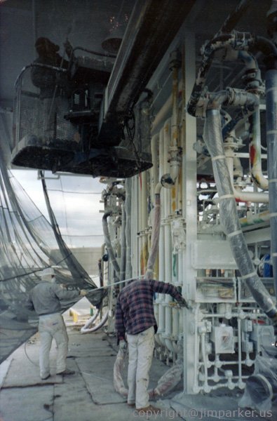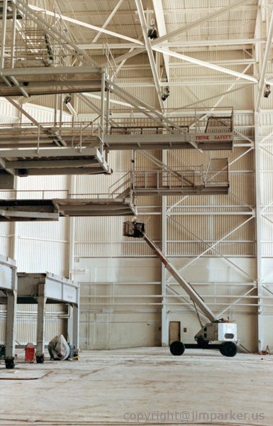 Jim Parker also completed painting the office interiors and warehouses. We painted these at night to better accommodate the airlines. The acoustic panel ceilings were in rough shape, having not been re-painted since the 1960s when everyone was a heavy smoker, so they had deep yellow nicotine stains, which we blocked out with a high-quality primer and paint.