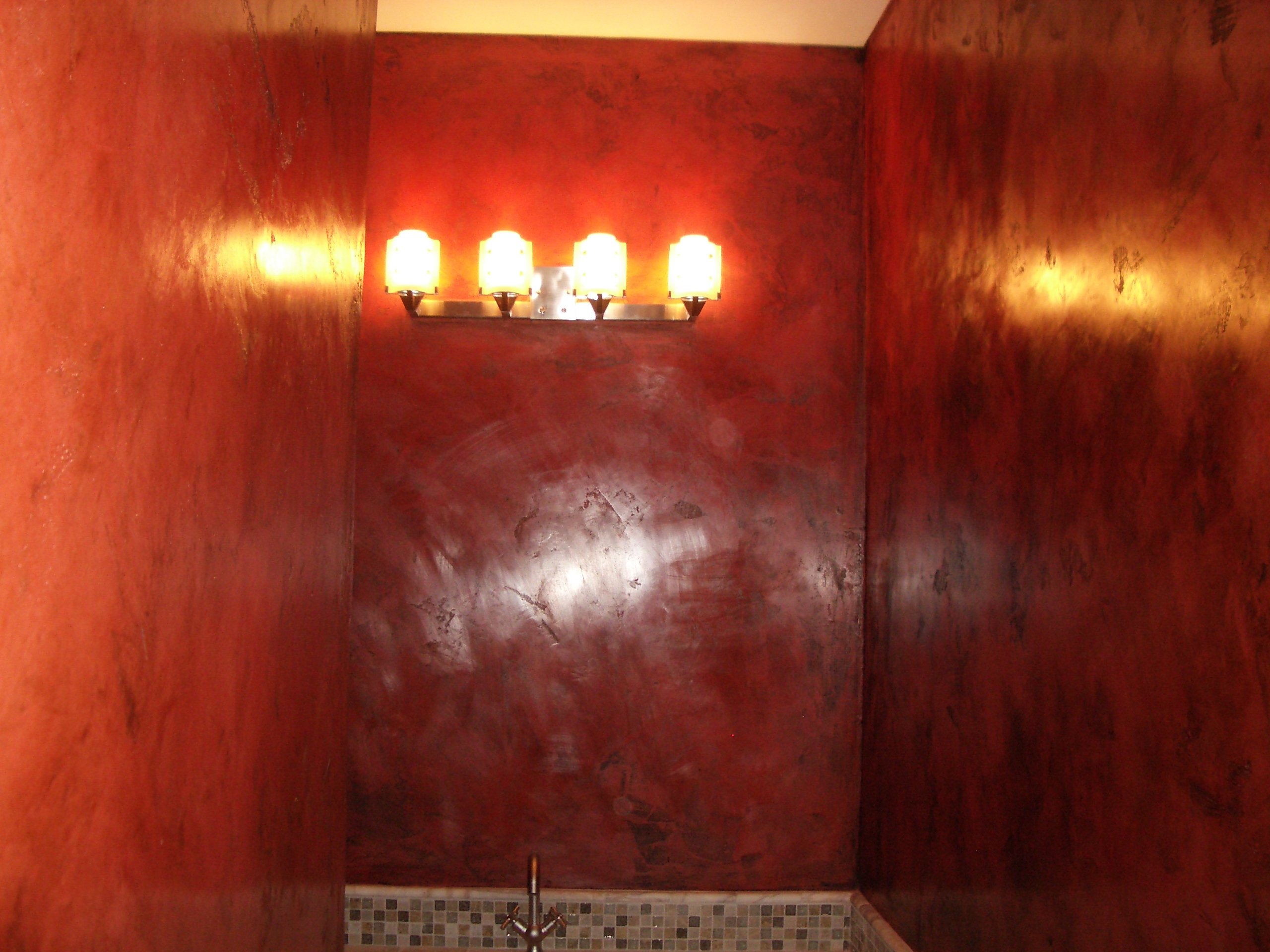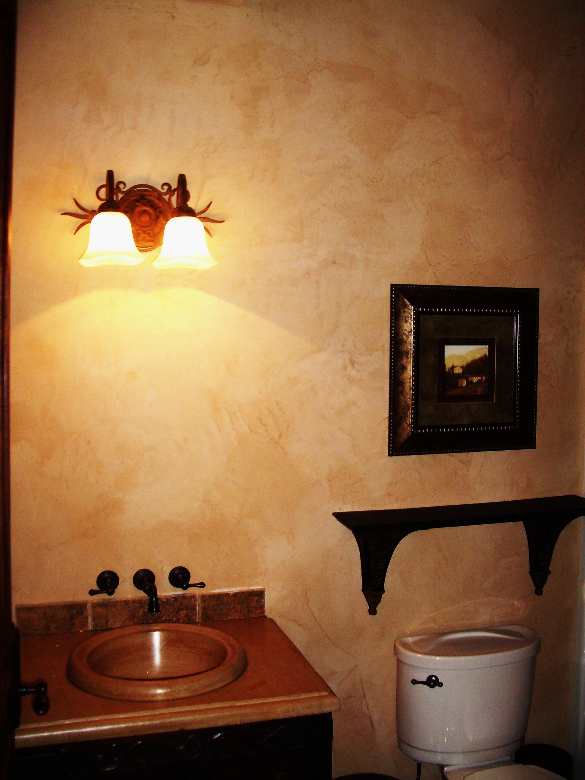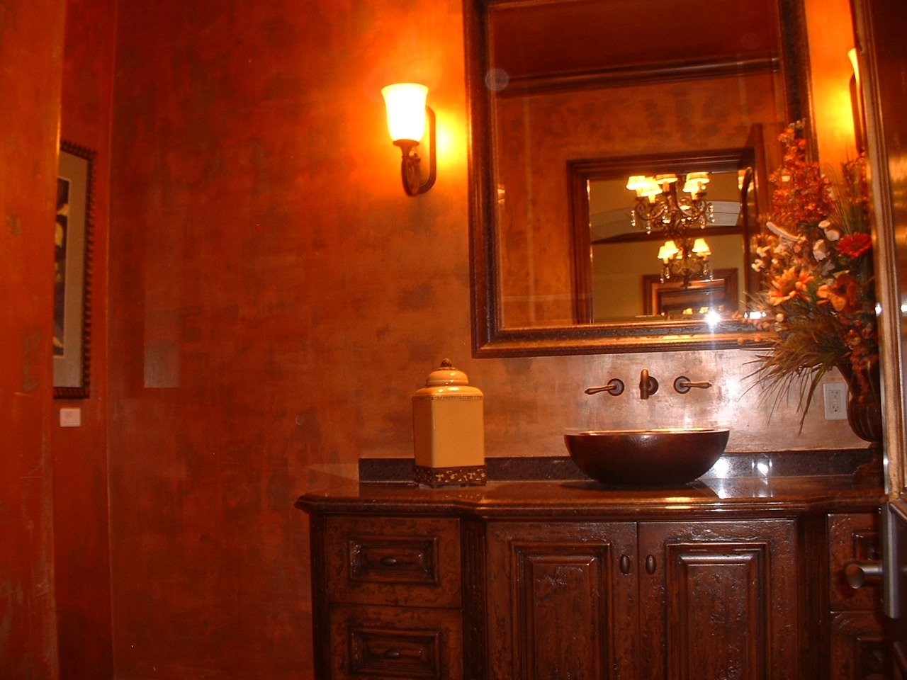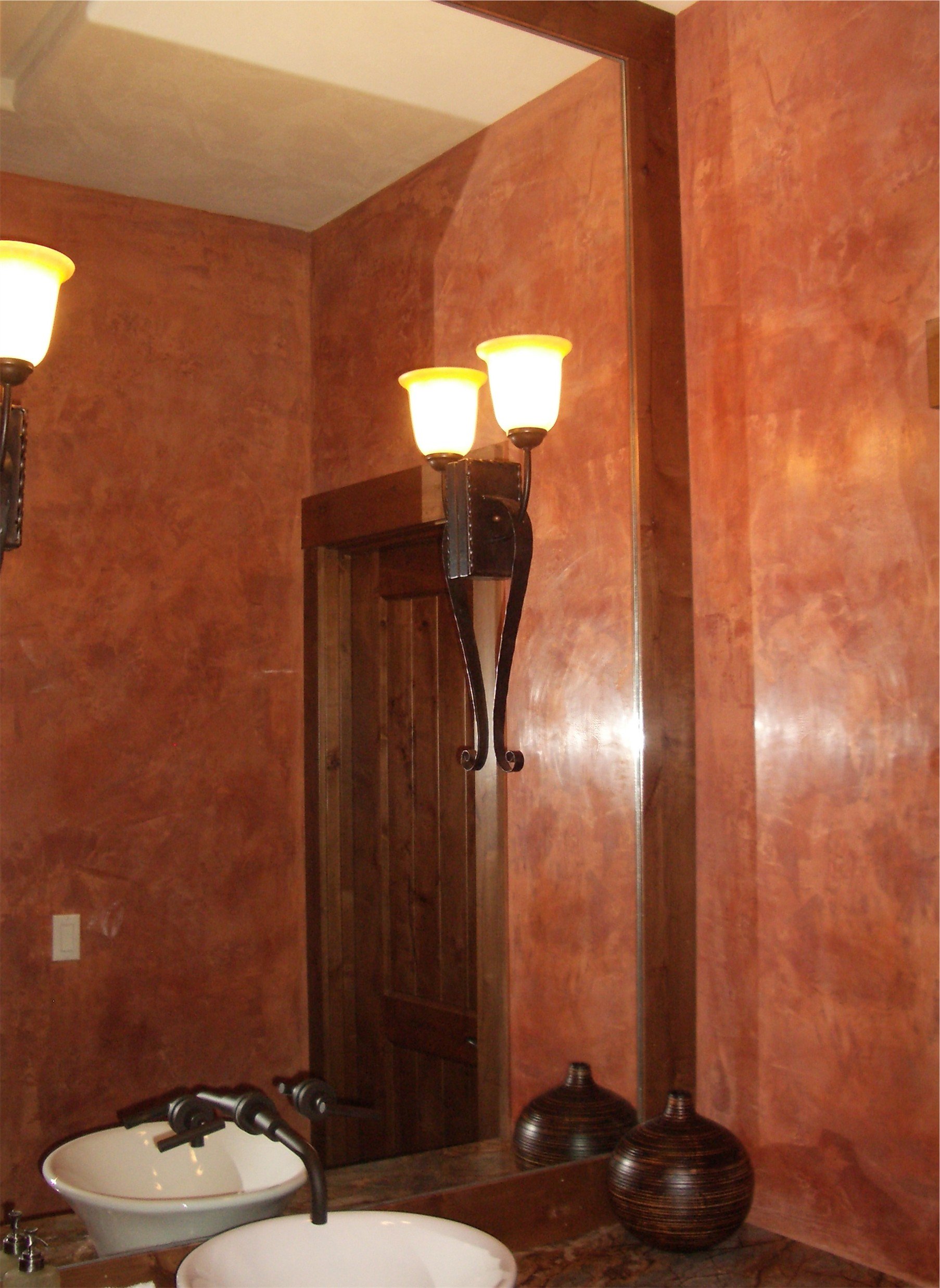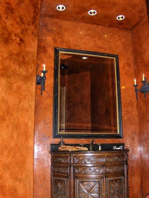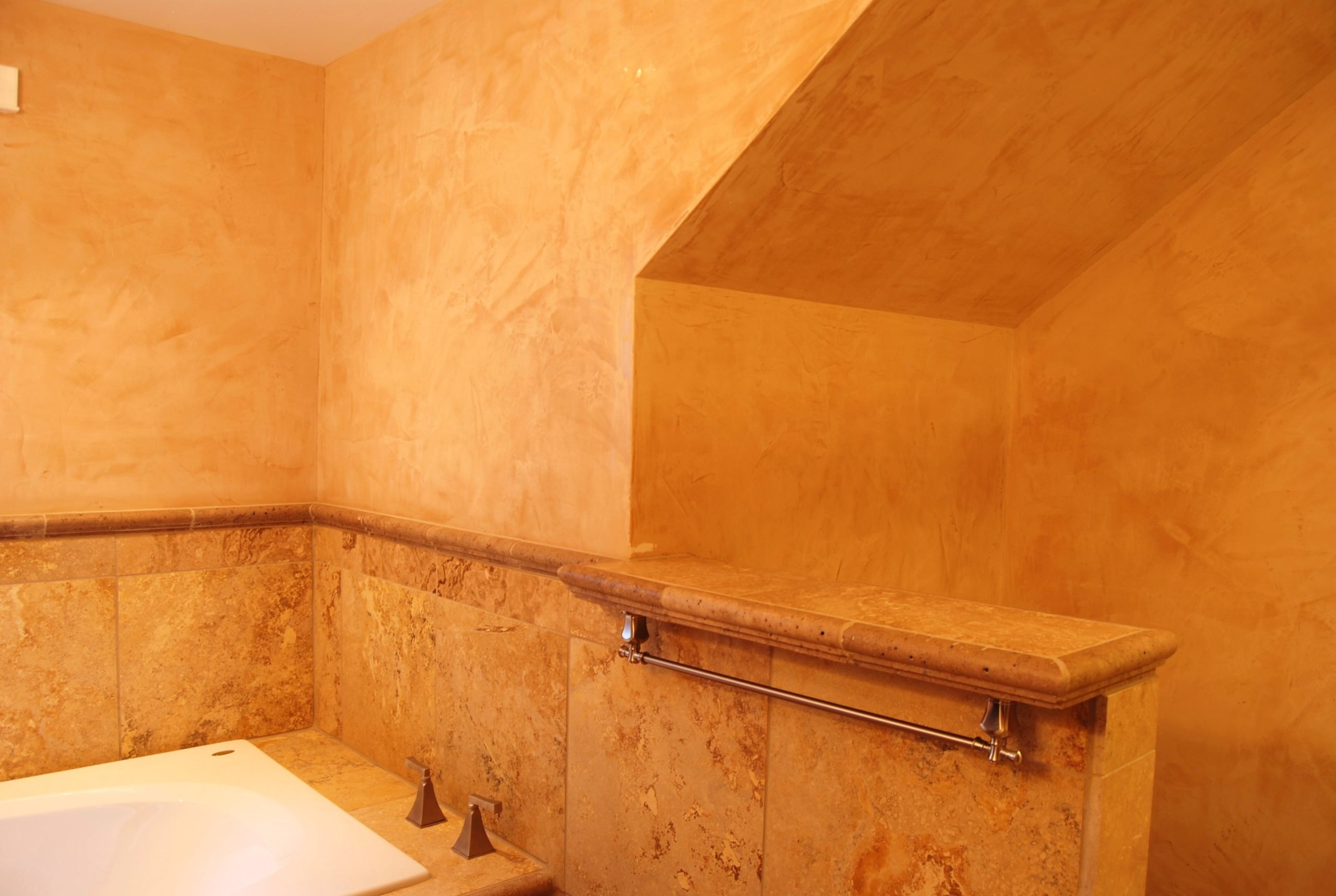 Venetian plaster is clean and will not support any mildew growth. Venetian Plaster has a much tighter and smoother surface than sand plaster, it will outlast sand plaster many times over. Venetian plaster still graces many Italian buildings since Roman times. Venetian plaster can be stained multiple times with different tints giving it a complex very rich interesting decorative look. It can be made to match up or complement any stone, granite, marble, tile, etc. We can make up 24″x 24″ sample boards to satisfy even the most demanding decorators, architects, or owners.