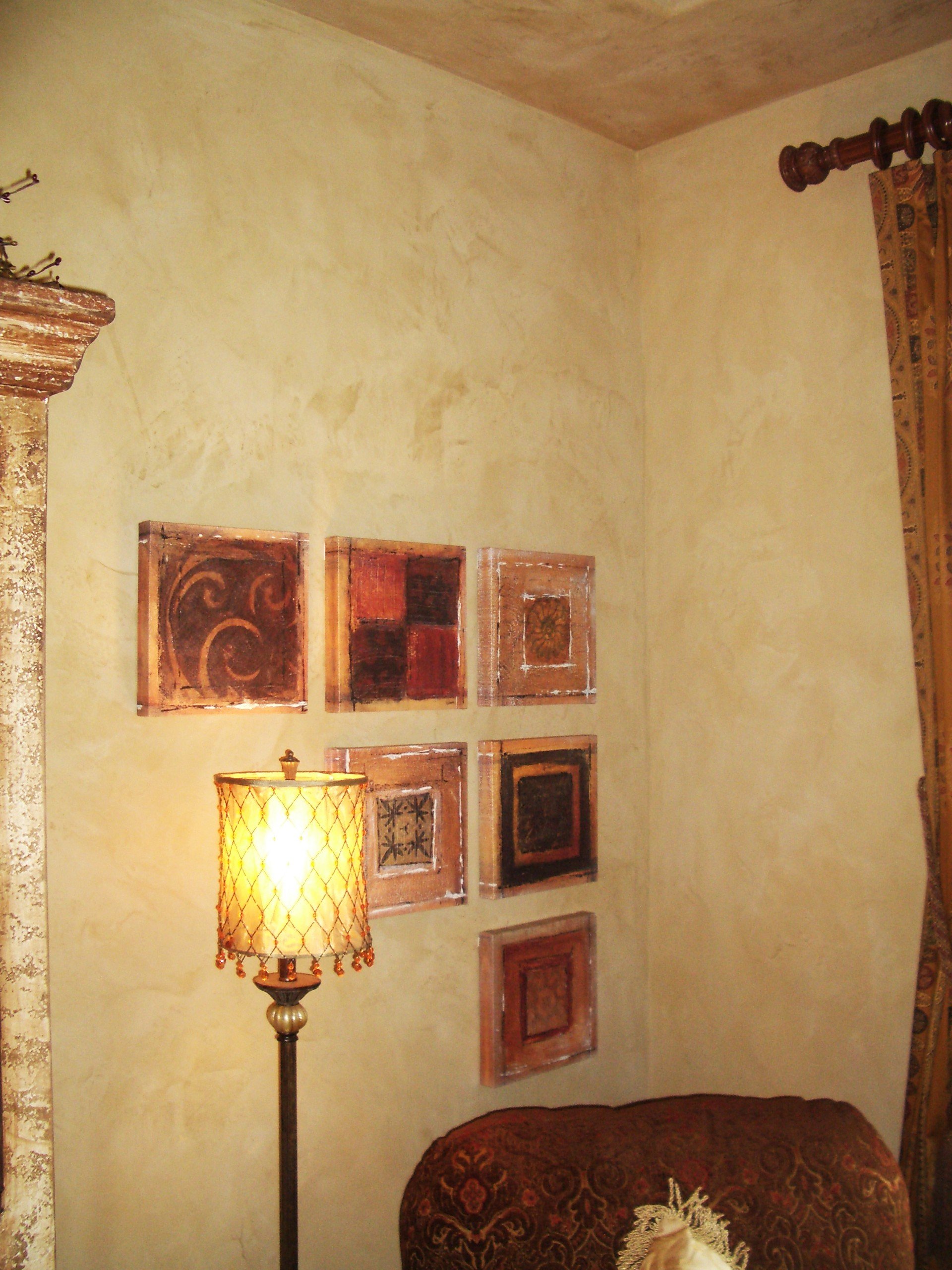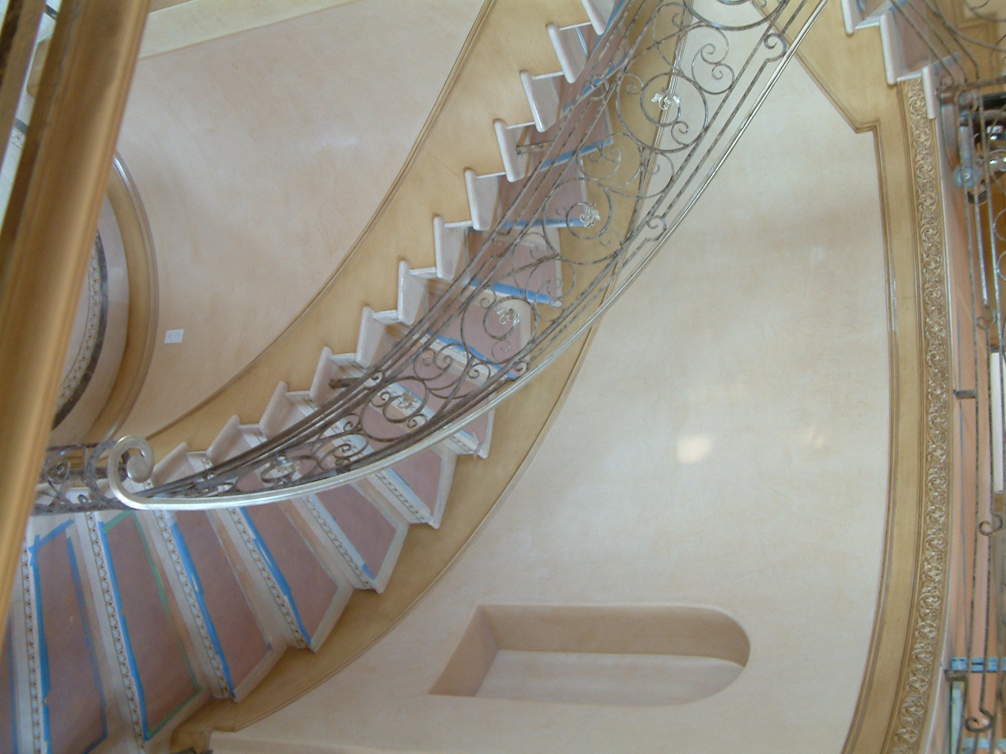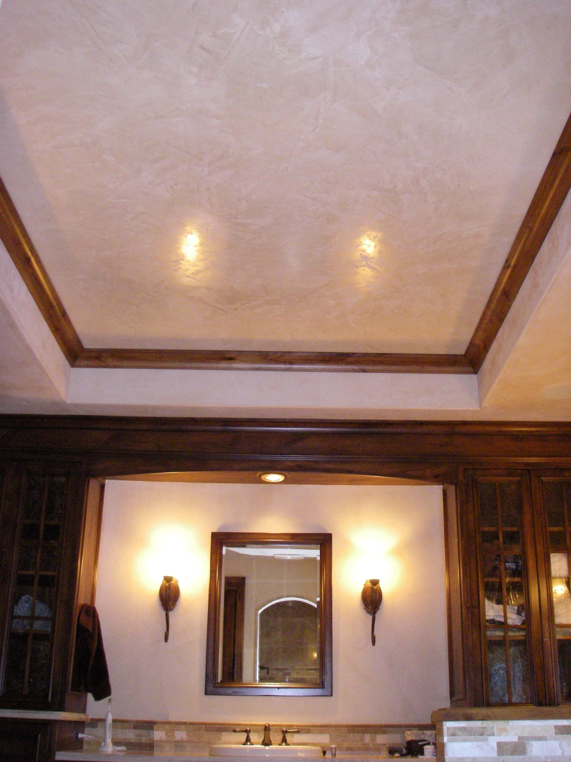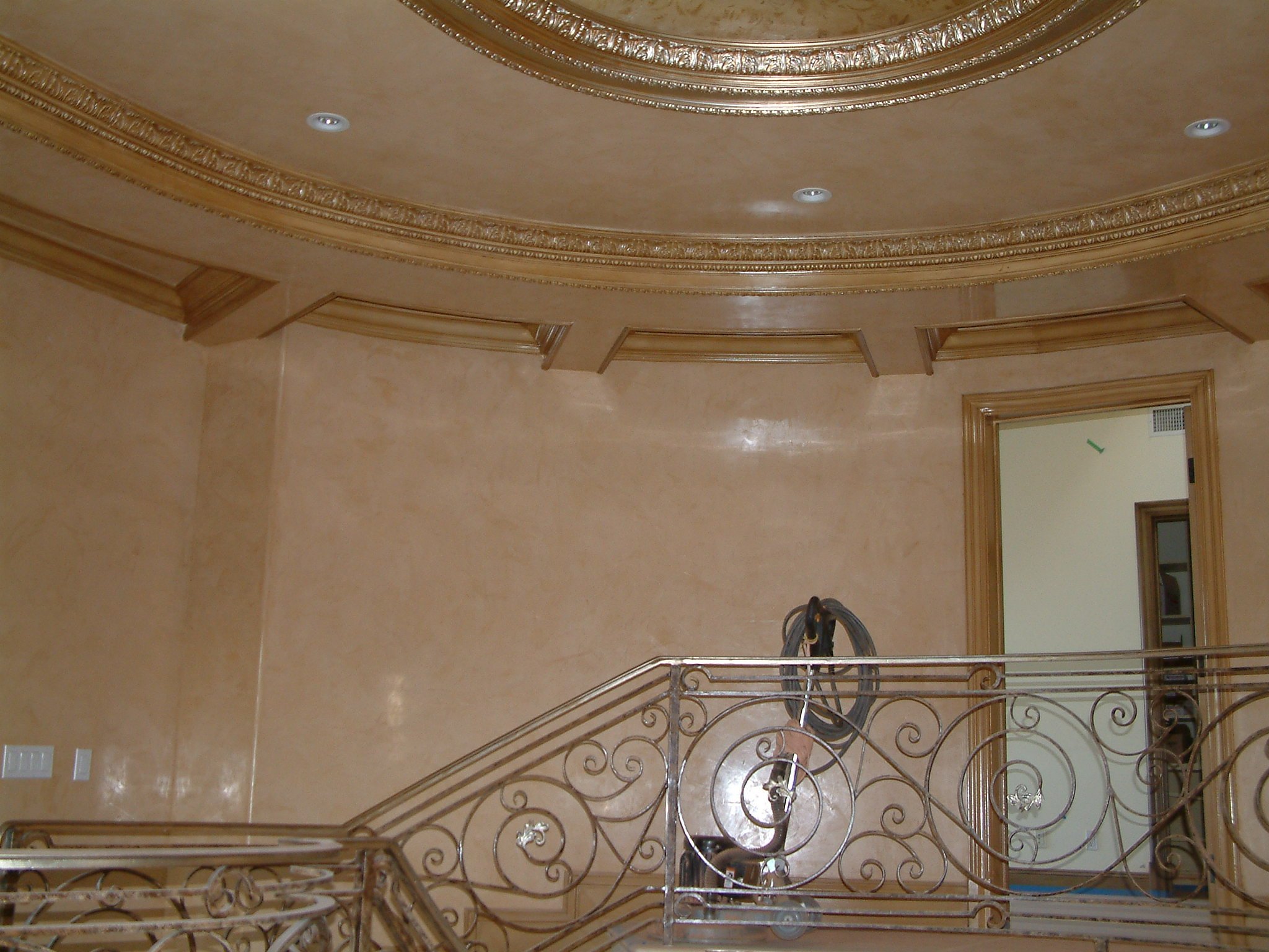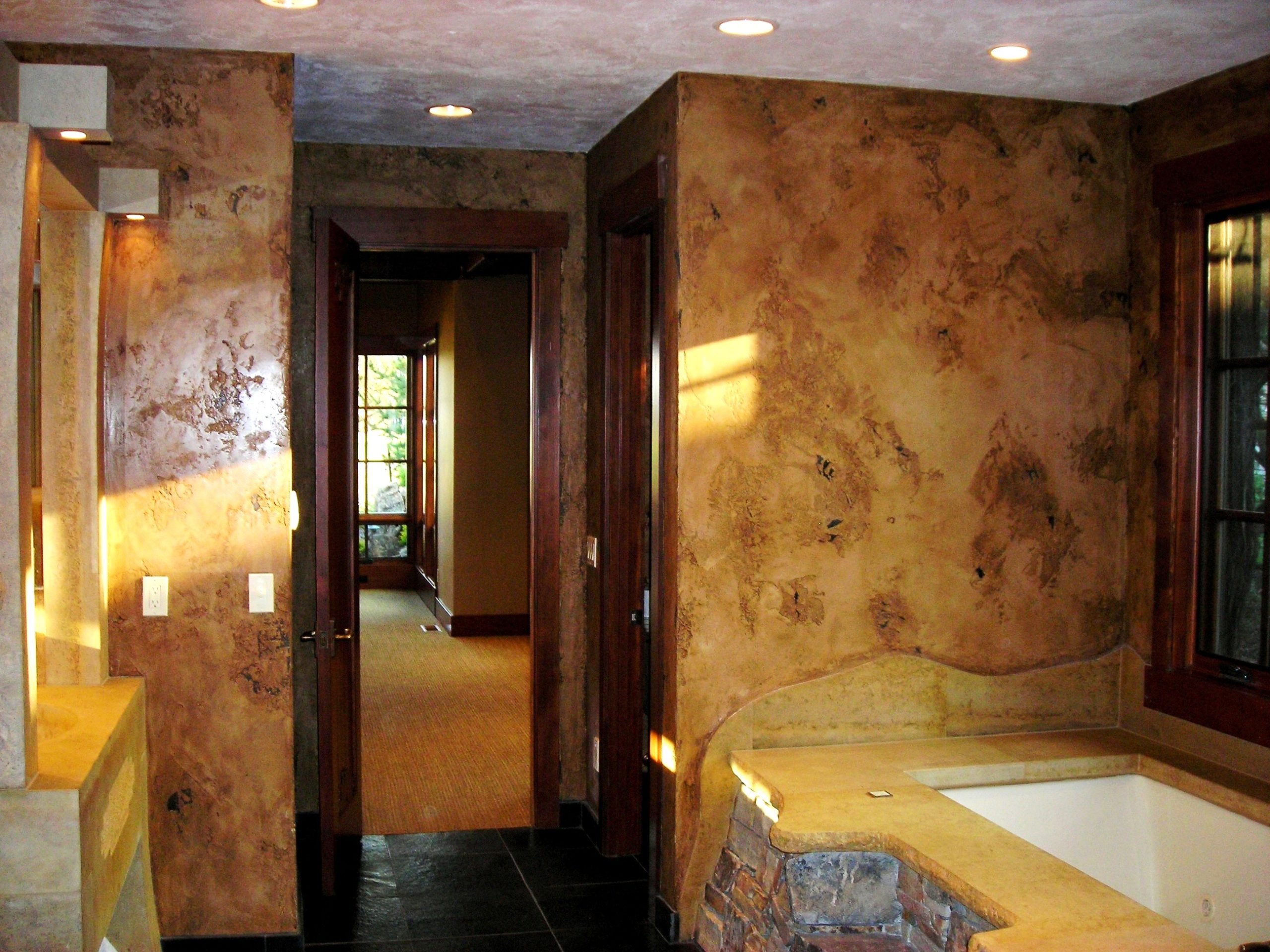 Venetian plaster is clean and will not support any mildew growth. Venetian Plaster has a much tighter and smoother surface than sand plaster, it will outlast sand plaster many times over. Venetian plaster still graces many Italian buildings since Roman times. Venetian plaster can be stained multiple times with different tints giving it a complex very rich interesting decorative look. It can be made to match up or complement any stone, granite, marble, tile, etc. We can make up 24″x 24″ sample boards to satisfy even the most demanding decorators, architects, or owners.